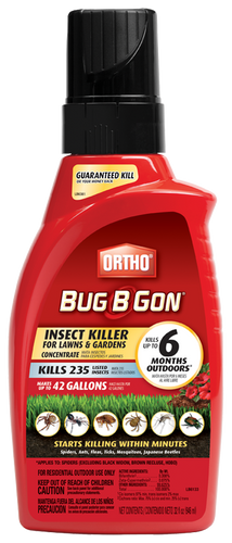 Ortho® Bug B Gon® Insect Killer for Lawns & Gardens Concentrate1 kills 235 listed insects including, spiders, ants, fleas, ticks, mosquitoes and Japanese beetles. One bottle makes up to 42 gallons and provides 6-months of protection*. This product starts to work immediately and satisfaction is guaranteed or your money back.